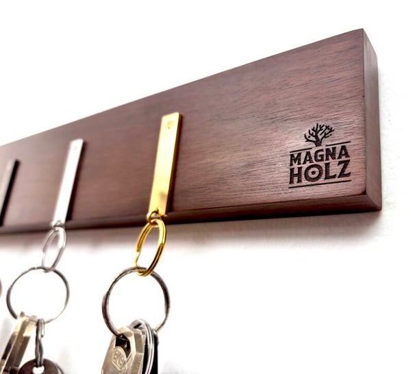 Our standard key magnet bar combines the natural elegance of black walnut wood with the dependable strength of dual high-capacity ferrite magnets. Designed for everyday functionality without the added expense of neodymium, it offers reliable holding power, though with a gentler magnetic force than our handcrafted neodymium models. This magnet bar is specifically designed to hold our Magna Holz keyrings, 4 of which are included in the price.